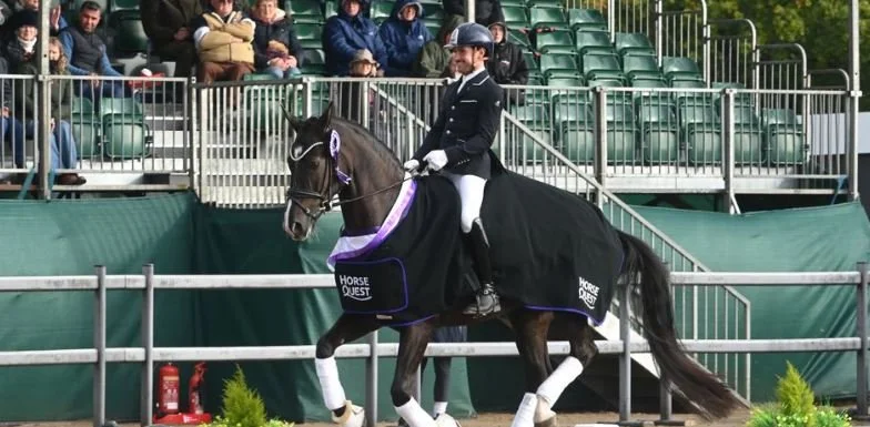 Sonnar Murray-Brown produced an outstanding test with his shining star Devina B, earning the HorseQuest Elementary Gold title on Sunday. Their winning score was 74.788% rewarded by Islay Auty, Jane Critchley, Mary Anne Horn, Sarah Leitch and Debbie Wardle; in a class of immense quality, the contest for the top placings was close – Dannie Morgan and Freya VII placed second with 74.485% and Bryony Goodwin was just a fraction behind on SJL Niko with 74.273,%.